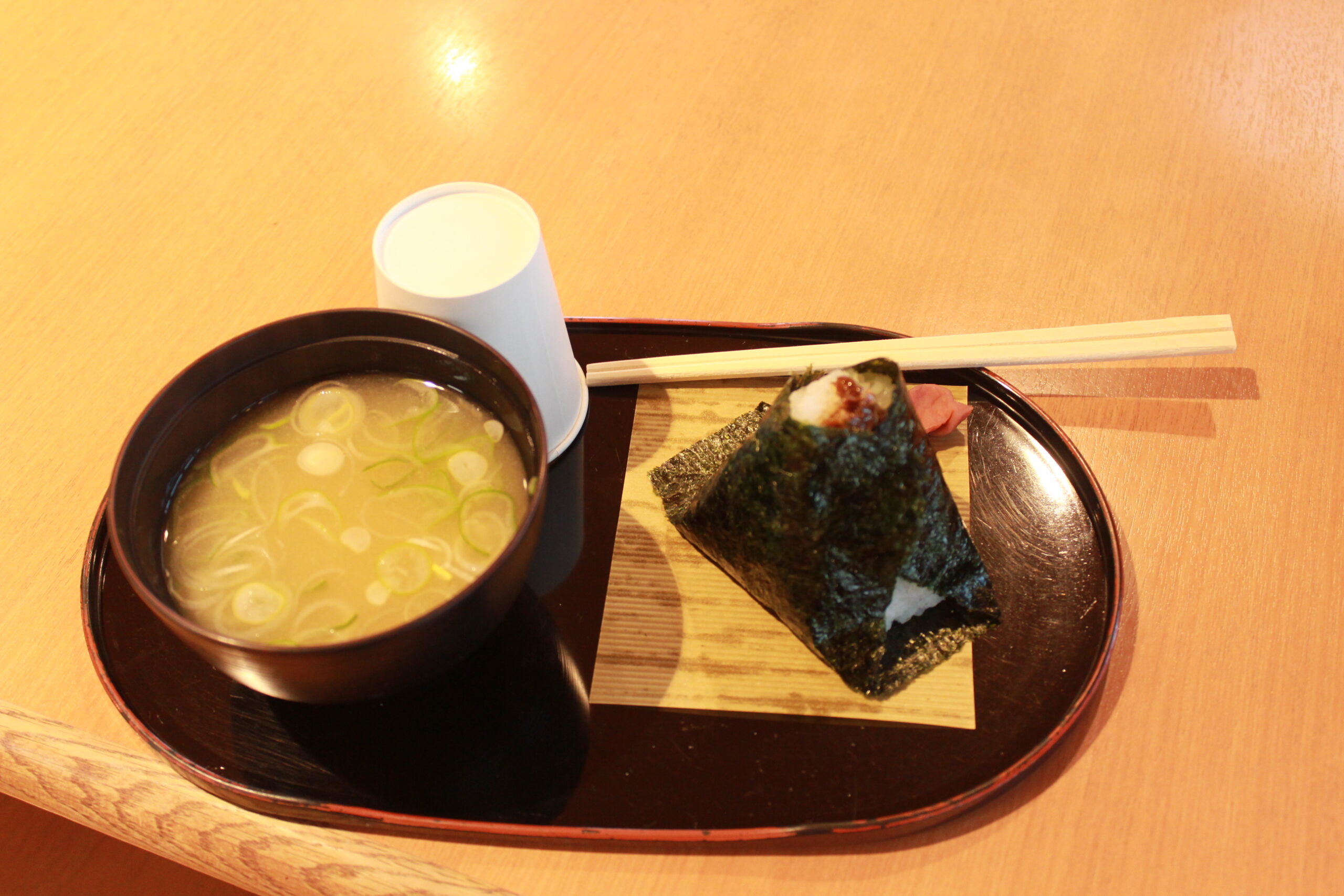 ここは軽食コーナーがあって、おにぎりが有名らしい。18:00までやっていて間に合ったので夕飯?おやつ?よくわからないけどおにぎりと味噌汁をオーダー。