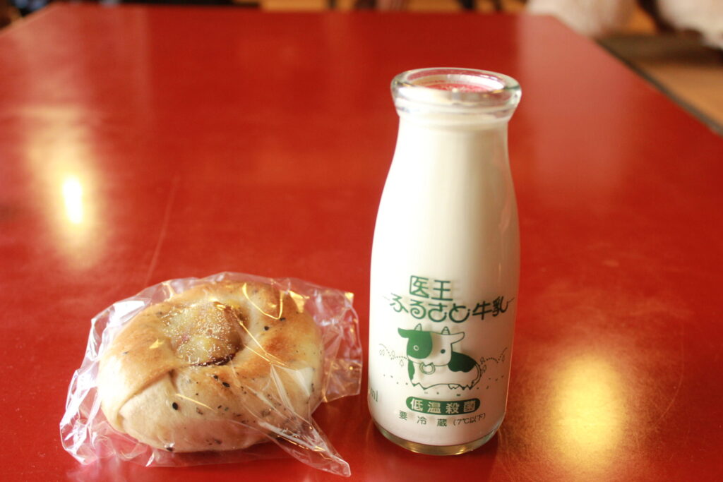 どっちも美味しかった!ベーグルはさつまいもがぎっしりで、牛乳はちょっと濃いめで。また食べたい。この牛さんの牛乳ビンもかわいい。