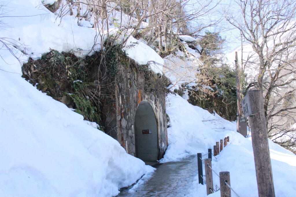 五箇山の集落が一望できるスポット、を示す看板に従って歩いていたら、トンネルが現れた!